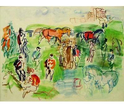 画暦: 北仏、ル・アーヴルに生れ、市から奨学金をもらいパリの美術学校に学ぶ。彼の作風は転々とし、始めはゴッホや印象派の影響を受け、マルケやマティスと知り合ってフォーヴ(野獣派)運動に参加。その後キュービスムの流行と共にブラックに惹かれ立体派風の風景を描き、さらにセザンヌの構成にも関心を示した。生活の為ポール・ポアル衣裳店でデザインの仕事をし、装飾美術からのヒントで絵画にも要素を取入れ次第に独自の世界を創っていった。デュフィはマティスより形態をより単純化し、装飾的にリズミカルで軽快な筆致で描き、水彩の名手といわれる。版画は初期に木版、主として石版、銅版を手がける。。 |